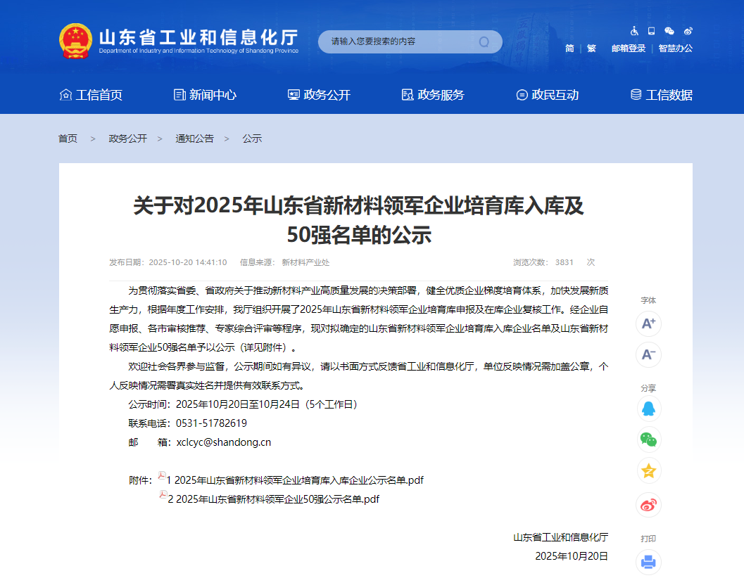 10月20日,山東省工業(yè)和信息化廳發(fā)布了《關(guān)于對(duì)2025年山東省新材料領(lǐng)軍企業(yè)培育庫入庫及50強(qiáng)名單的公示》。